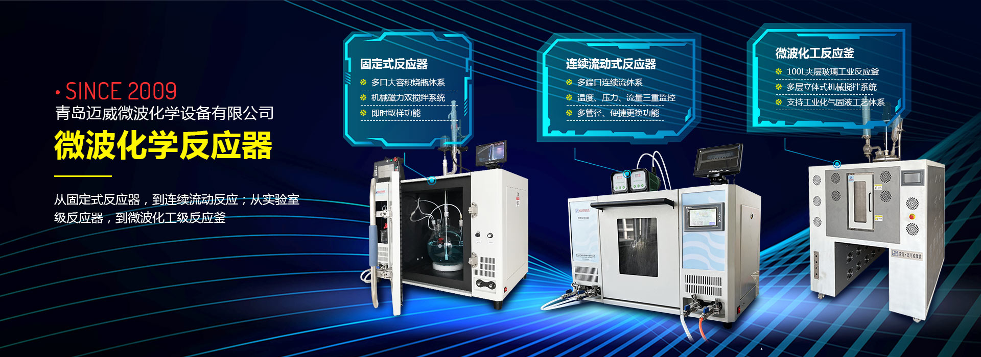青島邁威微波化學(xué)設(shè)備有限公司創(chuàng)立于2009年9月,公司坐落于青島國家高新技術(shù)產(chǎn)業(yè)開發(fā)區(qū),是一家專業(yè)從事微波技術(shù)在化學(xué)和化工領(lǐng)域應(yīng)用的科技型企業(yè)。邁威堅持“微波化學(xué)”作為產(chǎn)品設(shè)計和工藝研發(fā)的學(xué)科基礎(chǔ),致力于滿足用戶對化學(xué)實踐中“效率、速率、收率”的需求,擁有“開放式、密閉式、連續(xù)流動、微量以及高溫處置”五大類微波化學(xué)反應(yīng)體系,近百個產(chǎn)品種類,滿足了用戶對于化學(xué)、化工、新材料、生物制藥以及能源和環(huán)保領(lǐng)域的產(chǎn)品需求。